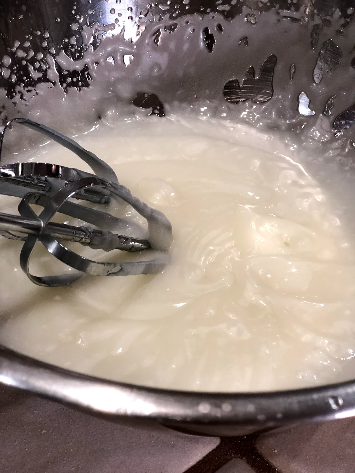 改換槳型攪拌棒,倒入所有蛋液後以中速混拌均勻(約1~2分鐘)。